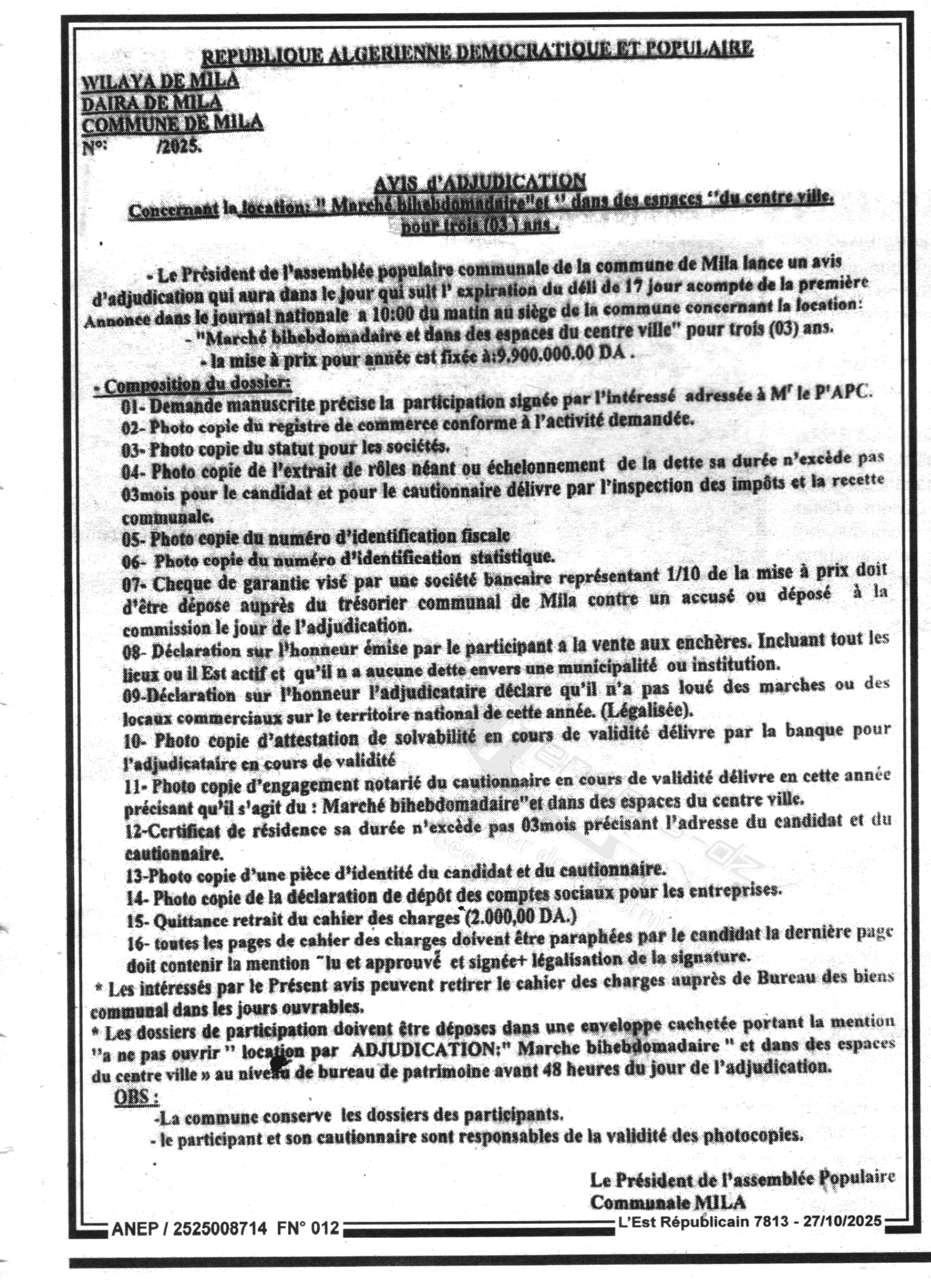 AVIS D'ADJUDICATION