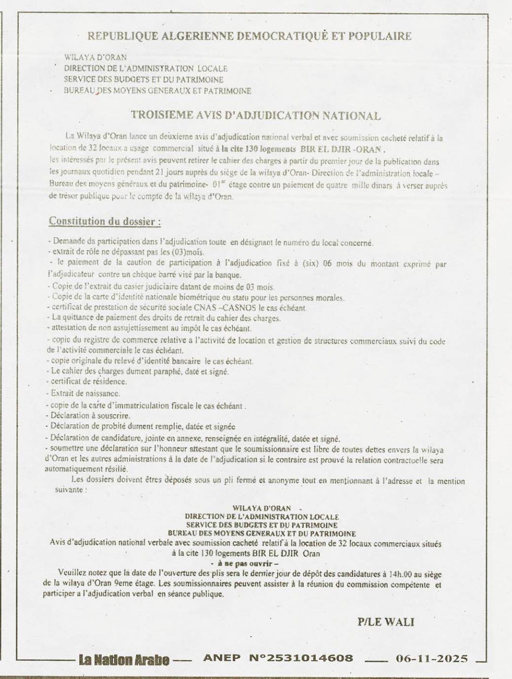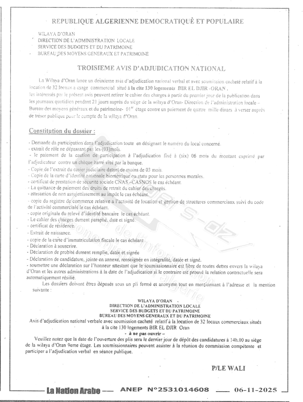 | Organisme : Dal Wilaya D'oran (direction De L'administration Locale) | |