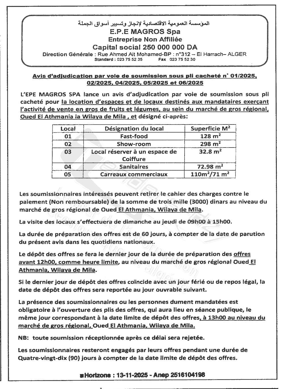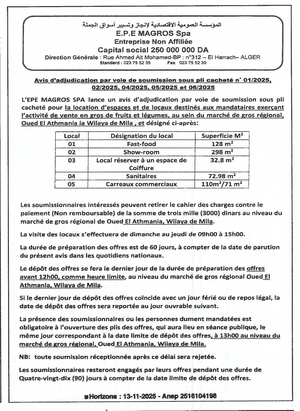 Montant de Retrait du Cahier des Charges : 3000.00 DA