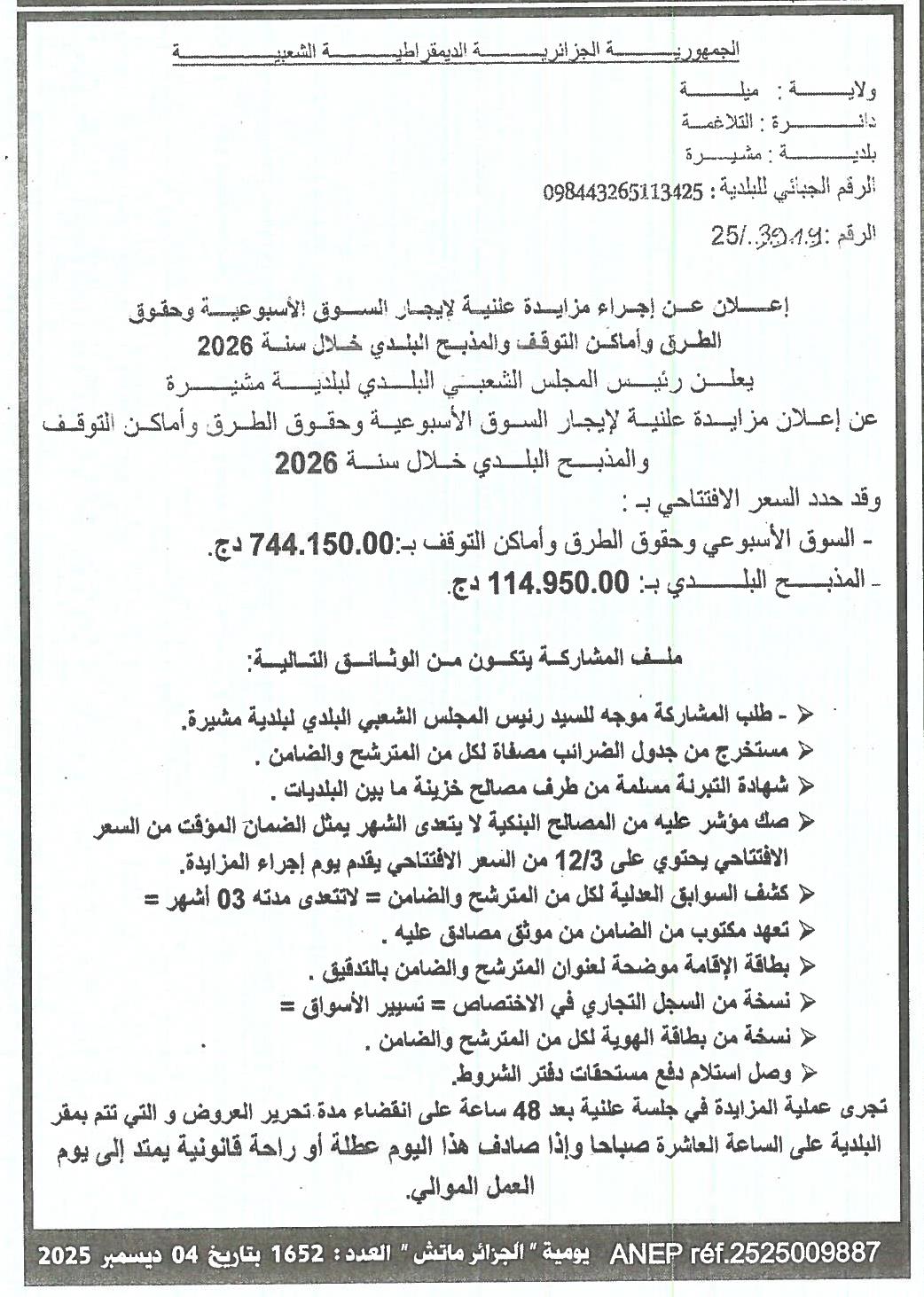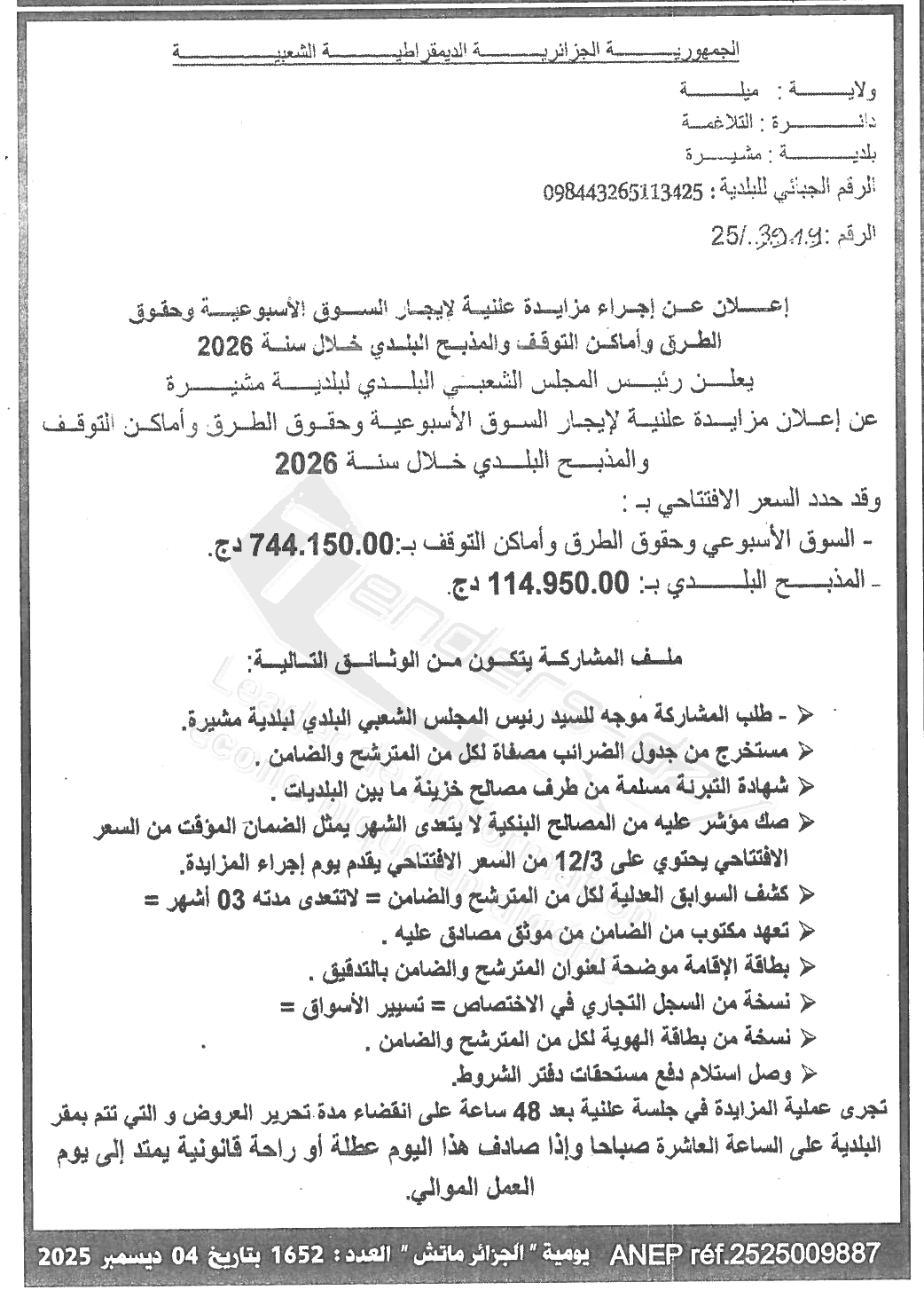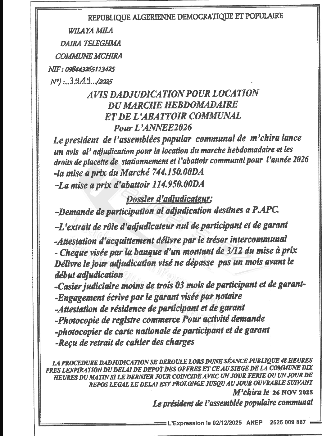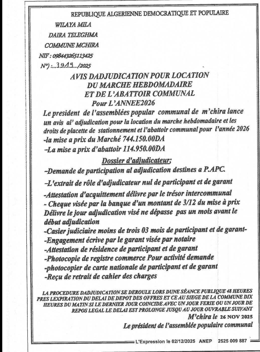 Location du marché hebdomadaire et les drois de placette de stationnement et l'abattoir communal Année 2026