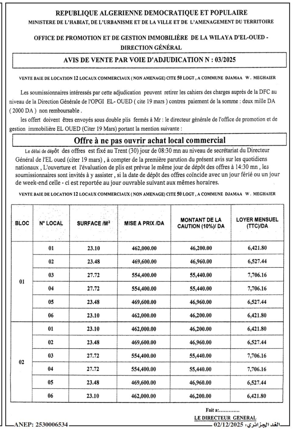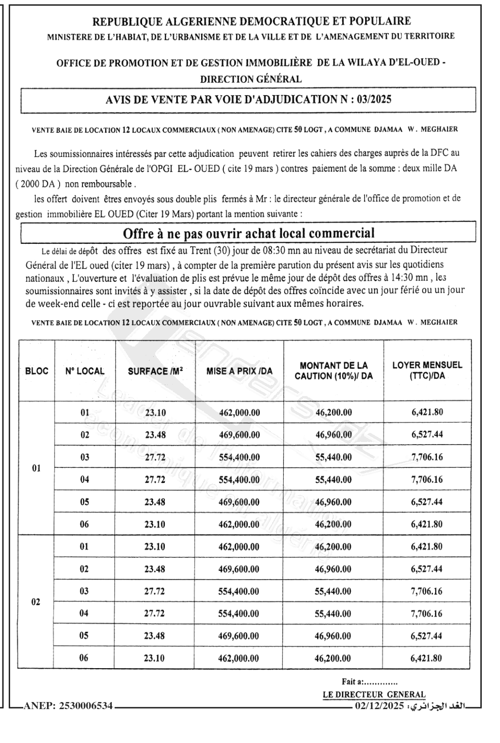 Montant de Retrait du Cahier des Charges : 2000.00 DA
