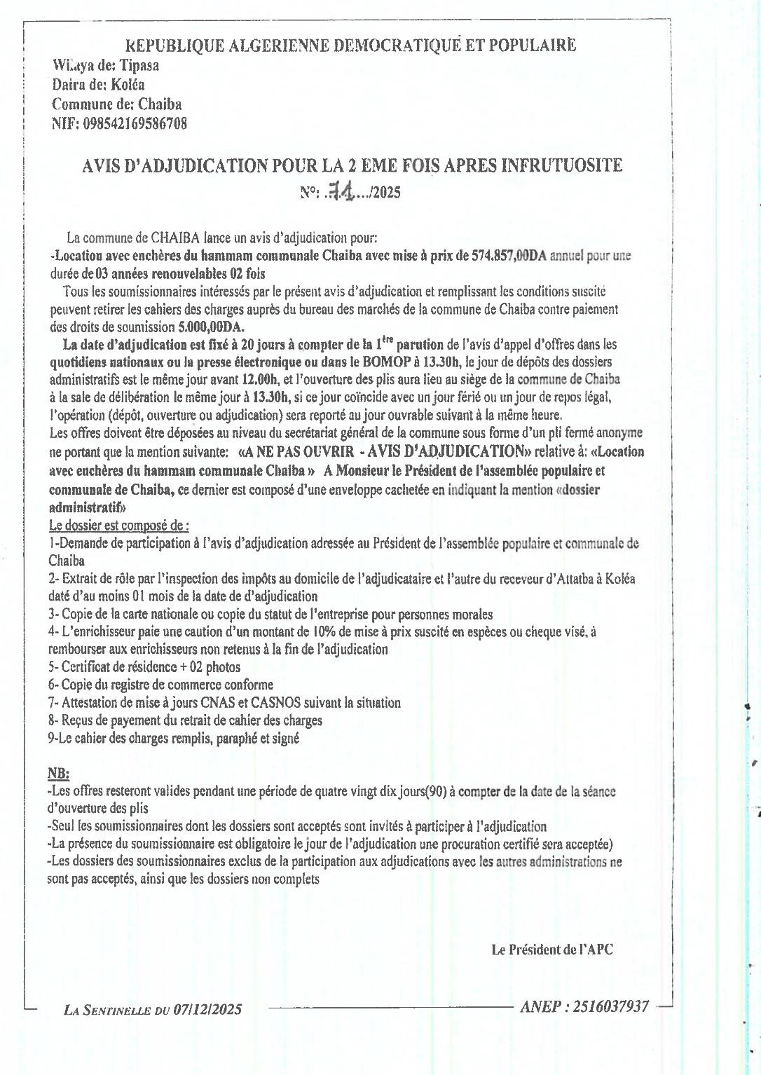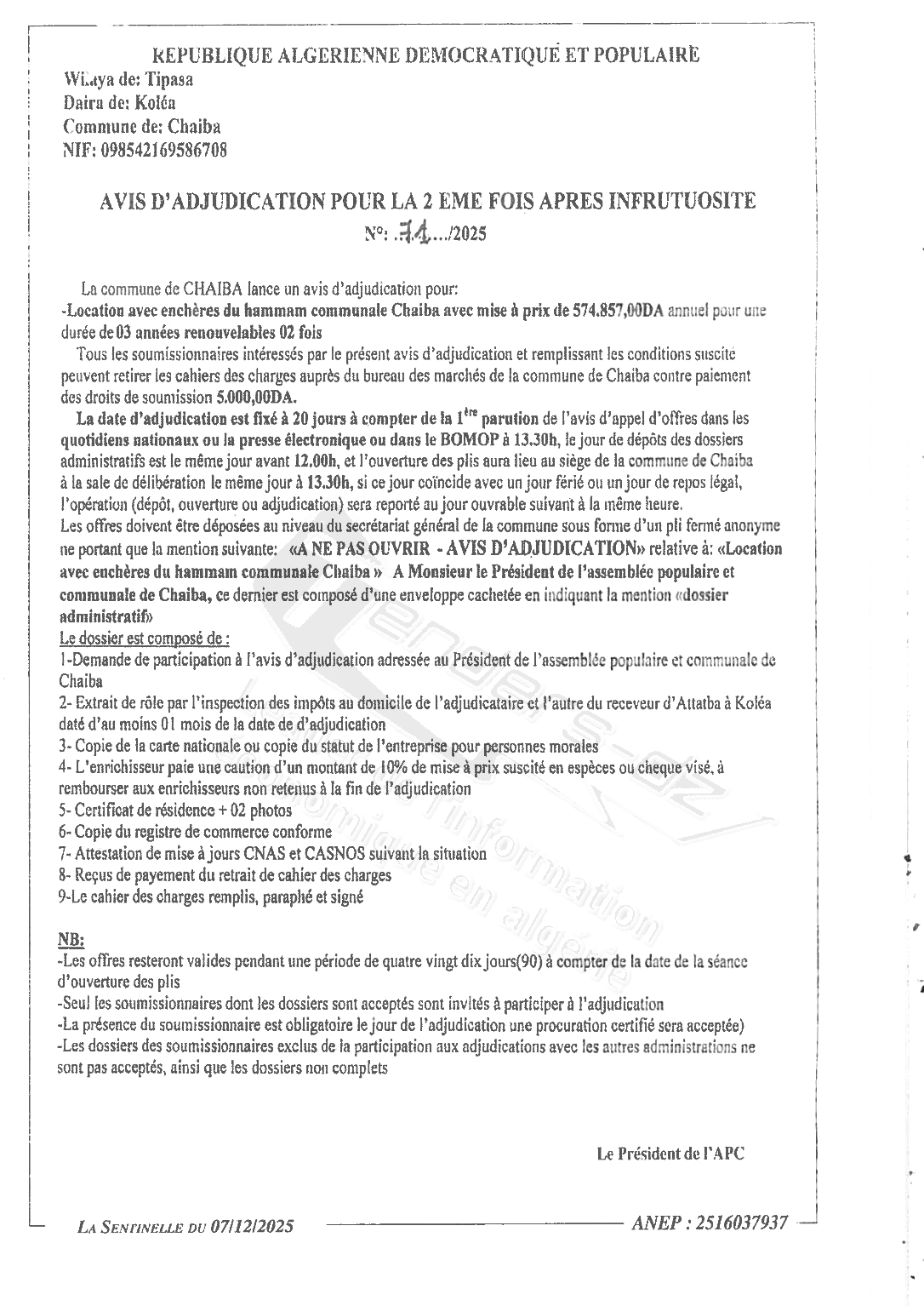 Montant de Retrait du Cahier des Charges : 5000.00 DA