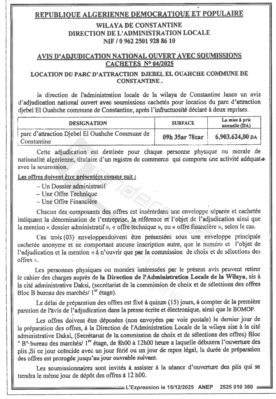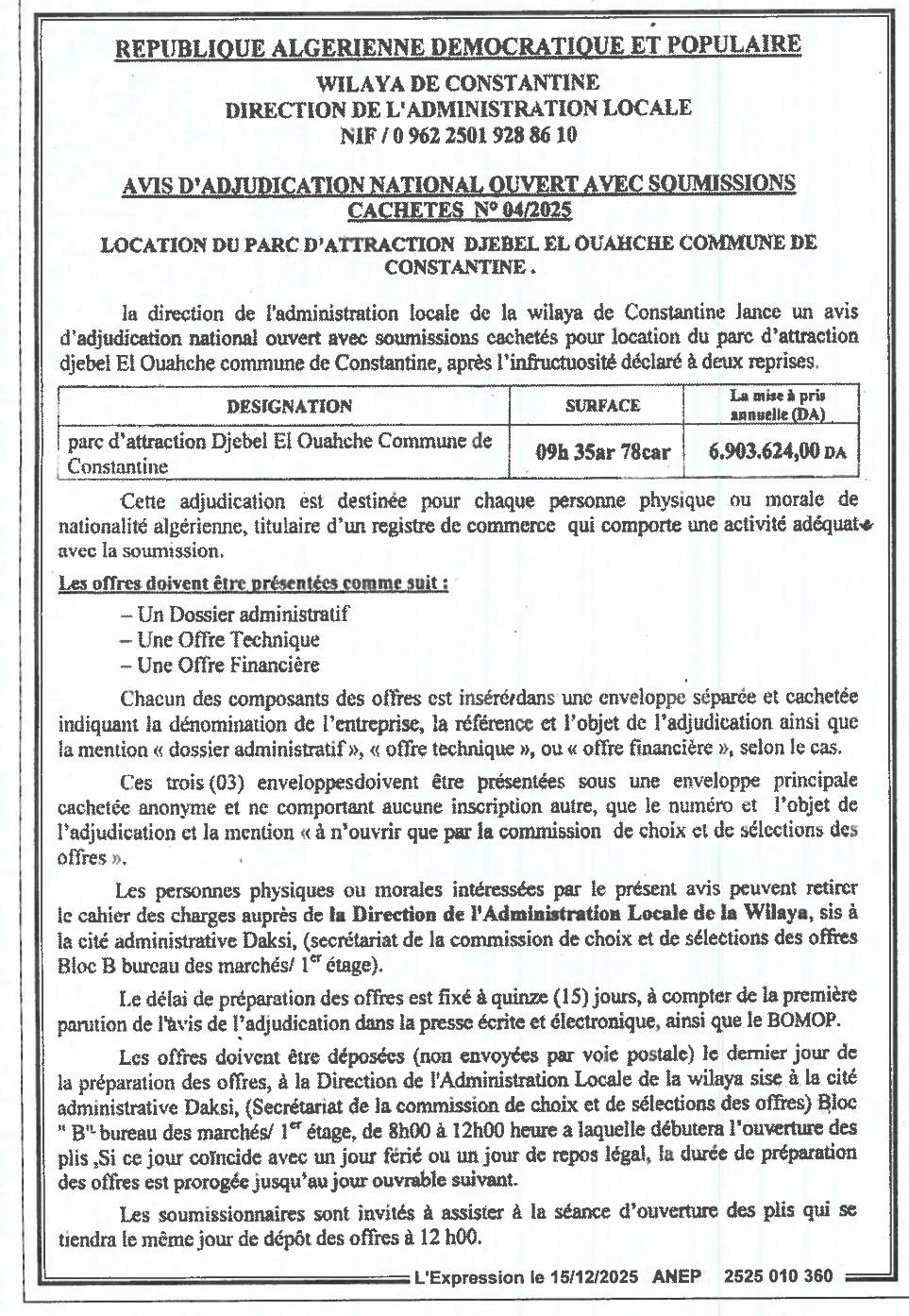 | Objet: Location du parc d'attraction Djebel El Ouahche commune de Constantine | |