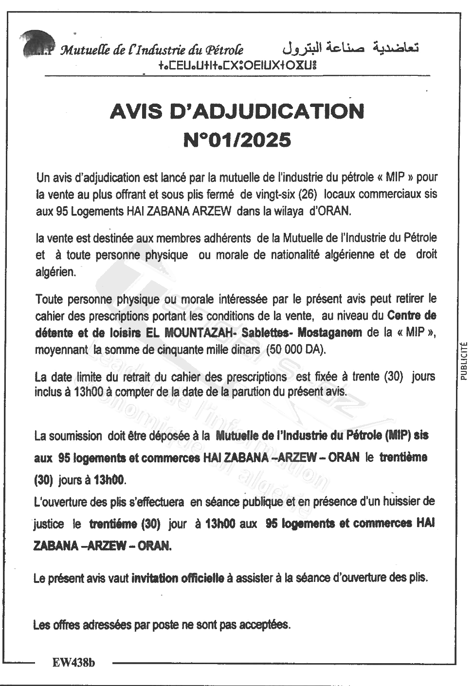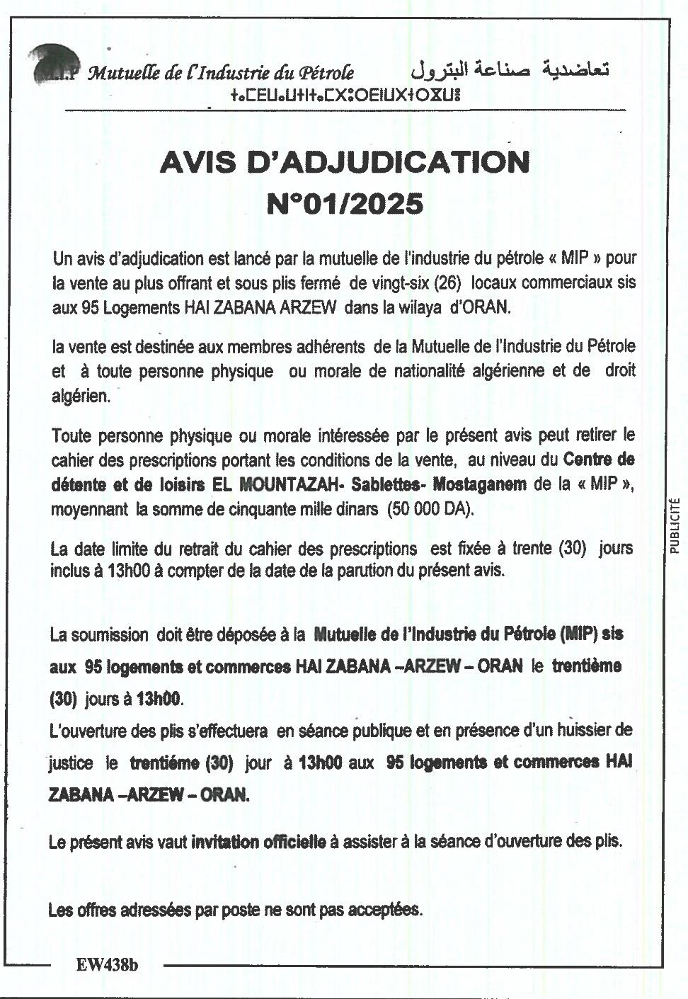 | AVIS D'ADJUDICATION | |