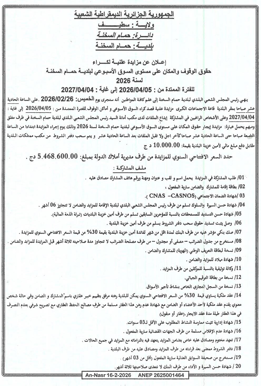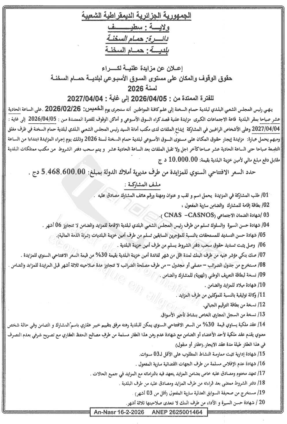 Montant de Retrait du Cahier des Charges : 10.000.00DA