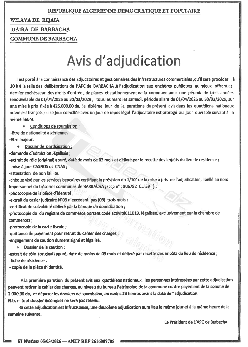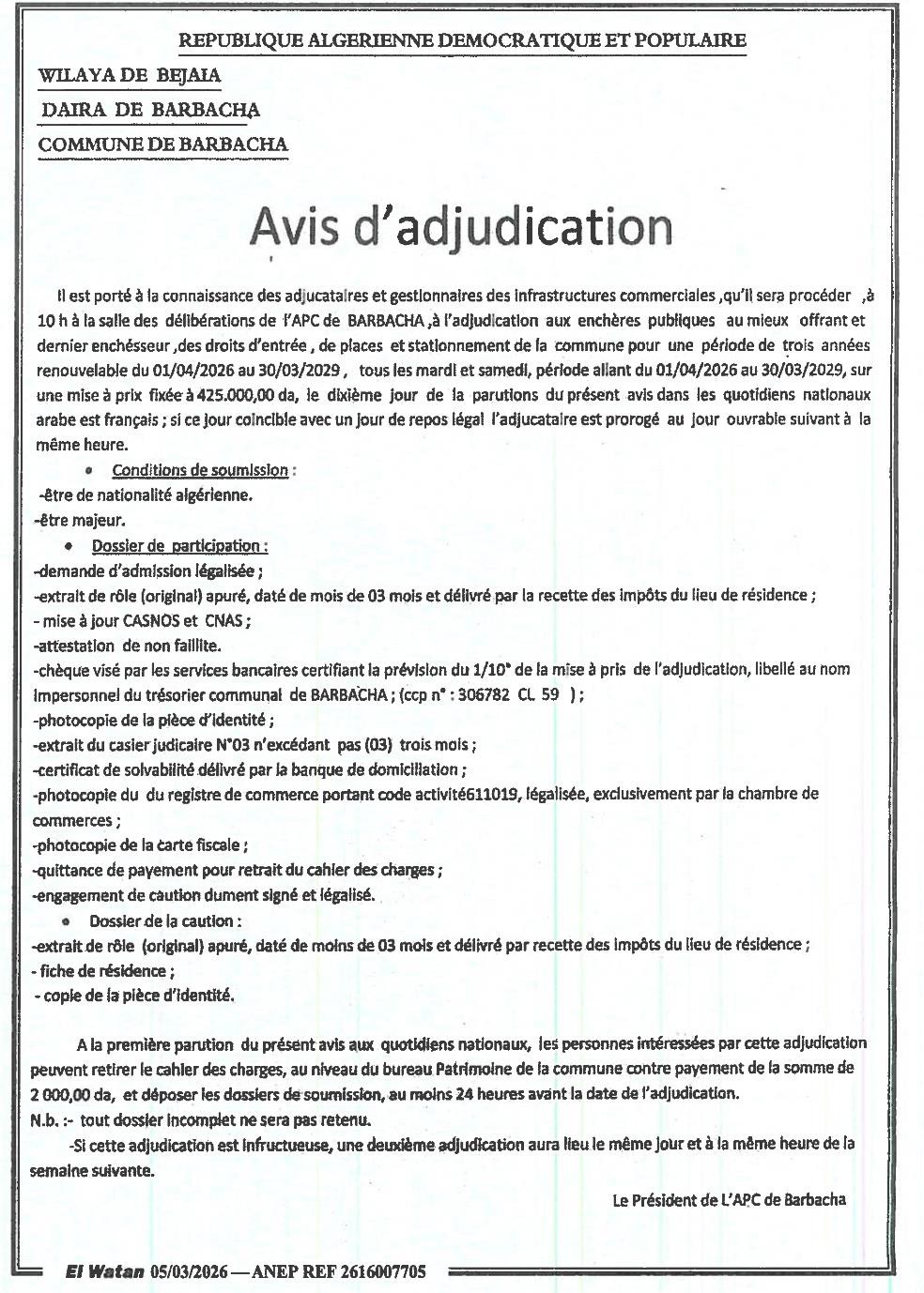 Montant de Retrait du Cahier des Charges : 2000.00DA