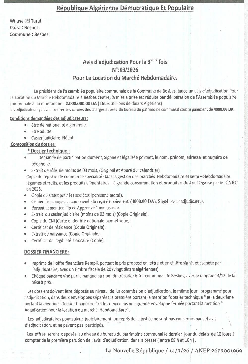 Location du marché hebdomadaire à Besbes centre