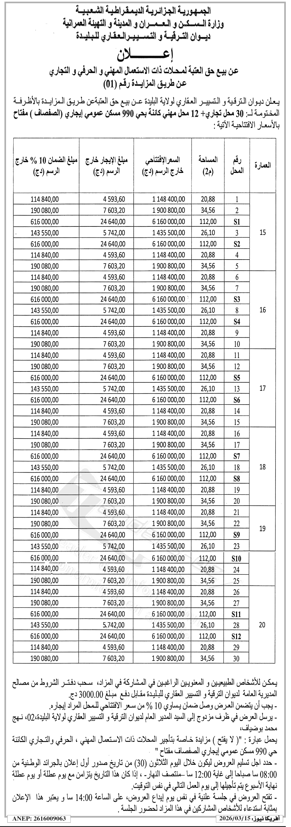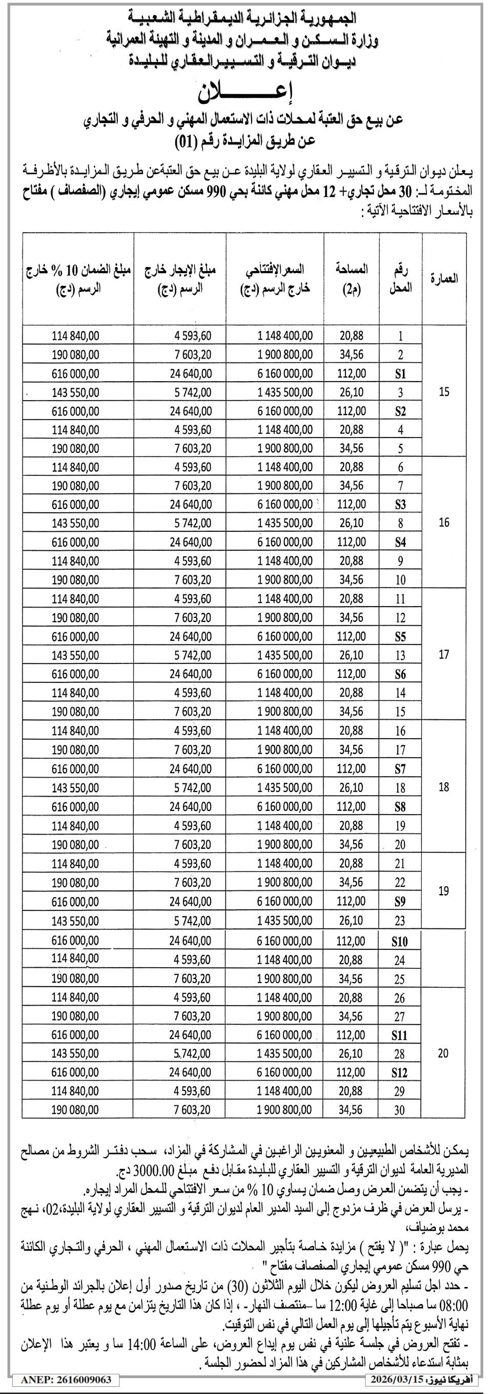 Vente des 30 locaux sis à Hai 990 LPL wilaya de Blida