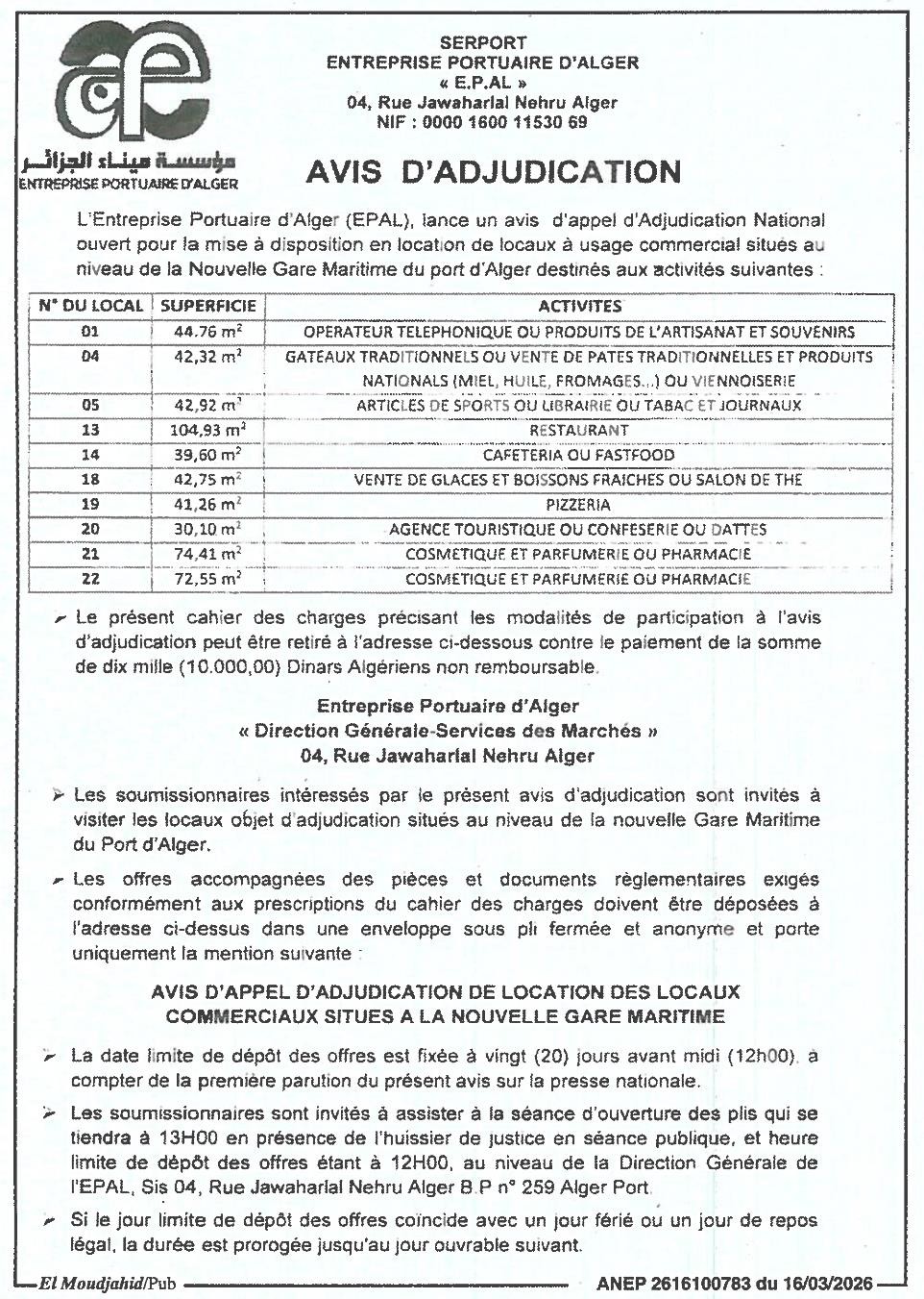Mise à disposition en locaux à usage commercial au niveau nouvelle Gue maritime du port d'Alger