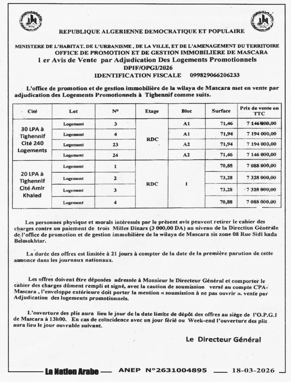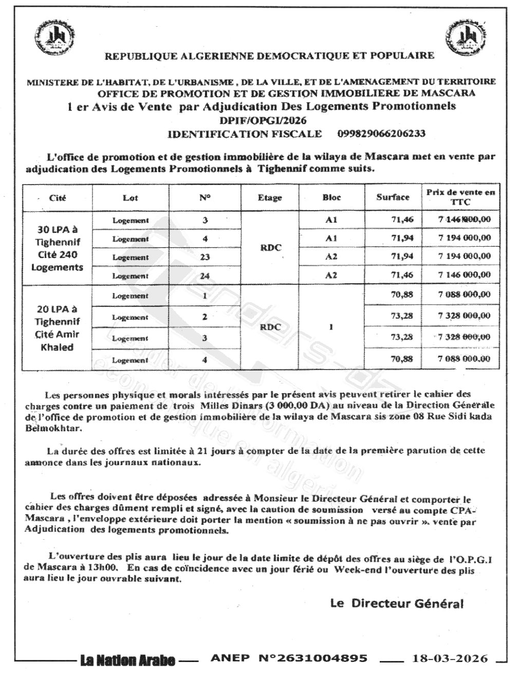 OPGI WILAYA DE MASCARA (OFFICE PROMOTION ET DE LA GESTION IMMOBILIERE)