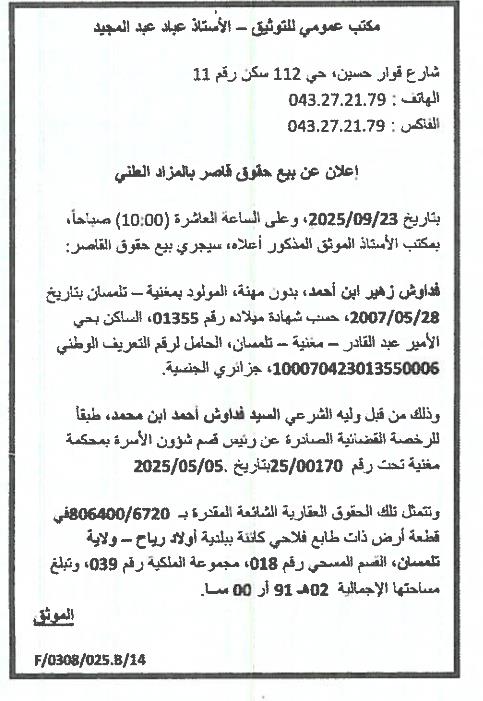 Il sera procédé à la vente au plus offrant et dernier enchérisseur le :