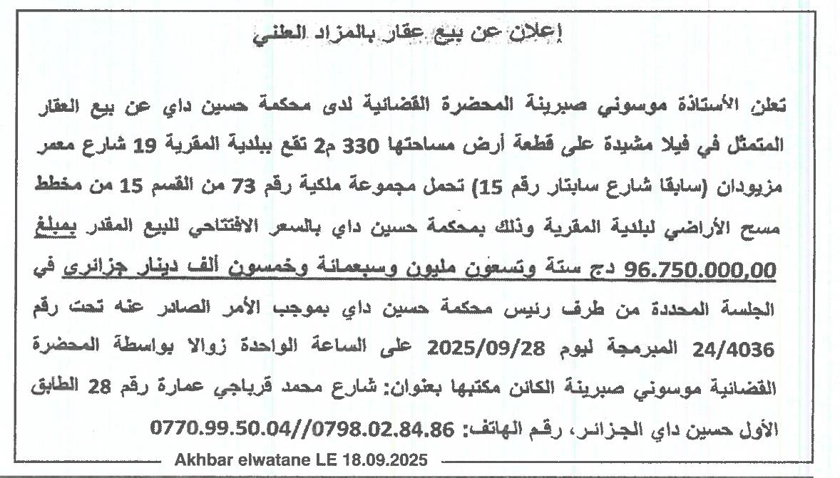 Il sera procédé à la vente au plus offrant et dernier enchérisseur le :