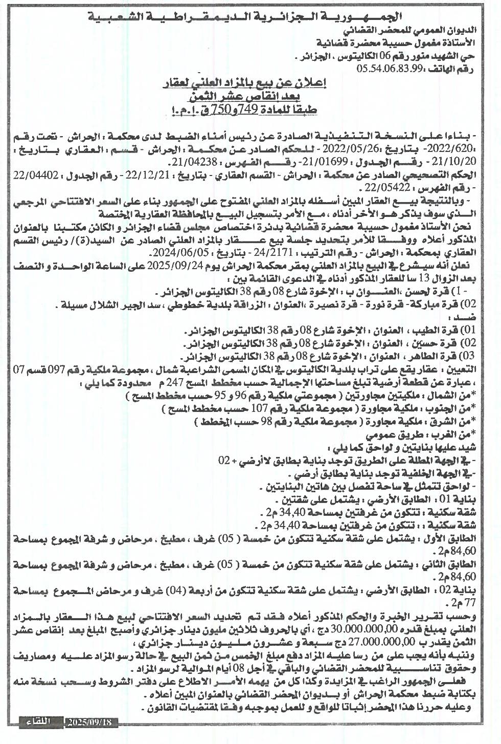 Il sera procédé à la vente au plus offrant et dernier enchérisseur le :