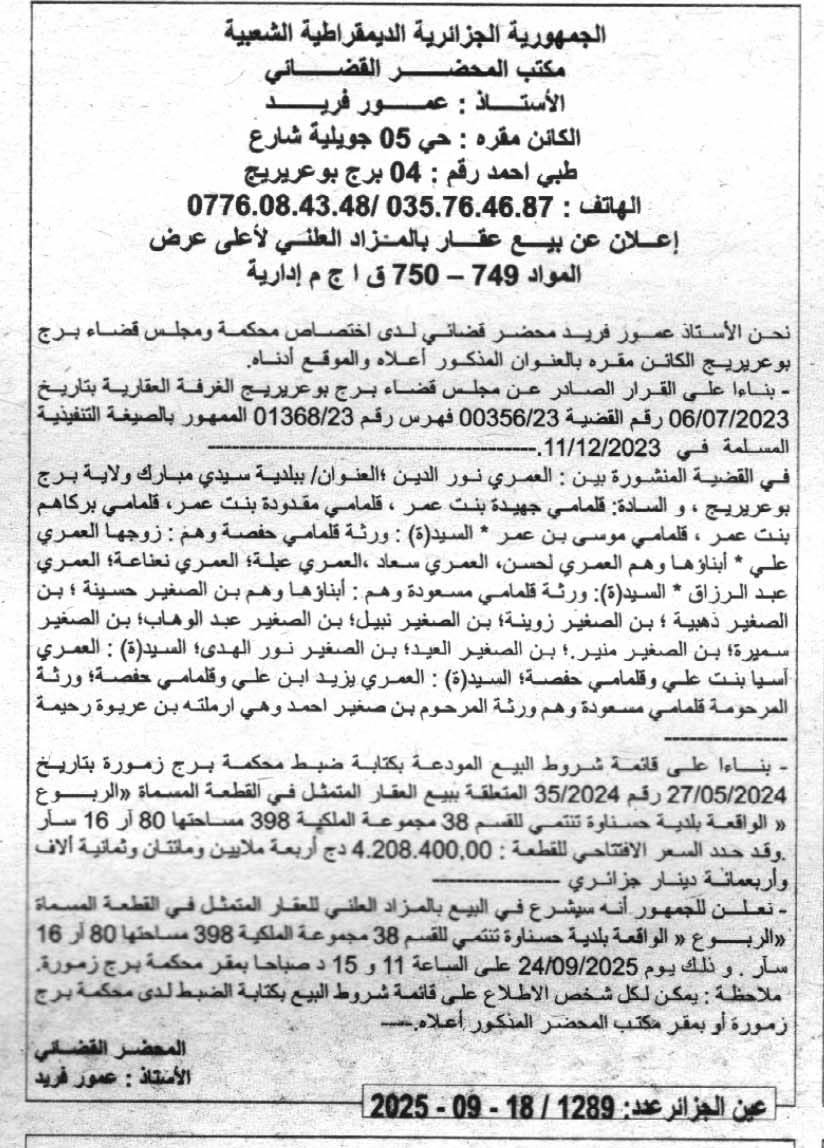 Il sera procédé à la vente au plus offrant et dernier enchérisseur le :