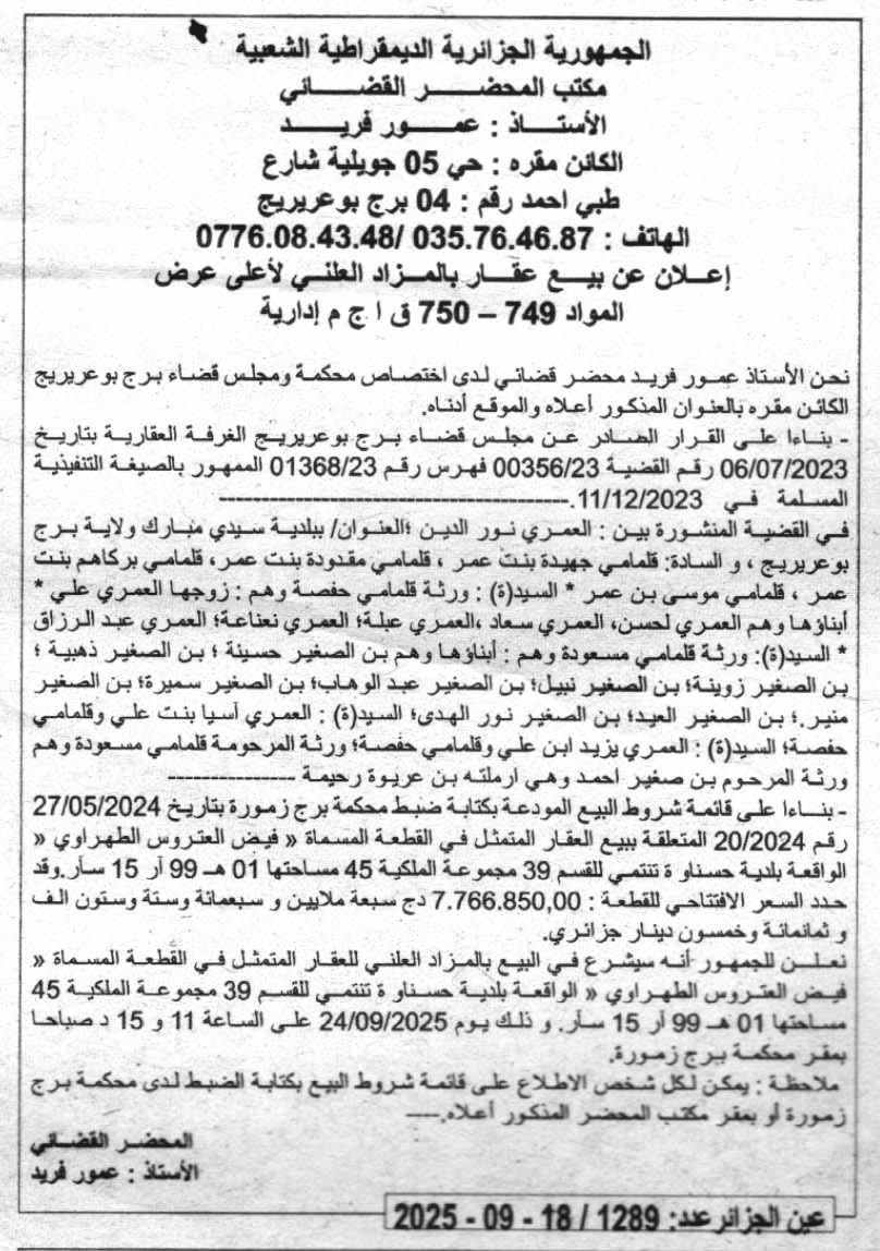 Il sera procédé à la vente au plus offrant et dernier enchérisseur le : 24/09/2025