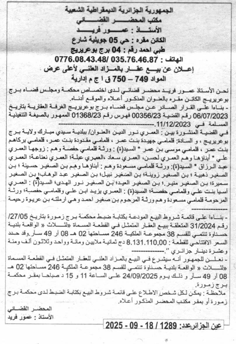 Il sera procédé à la vente au plus offrant et dernier enchérisseur le : 24/09/2025';