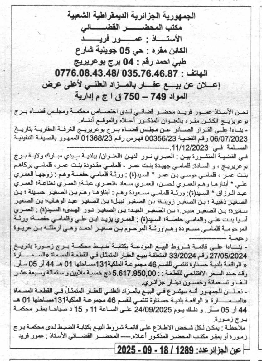 Il sera procédé à la vente au plus offrant et dernier enchérisseur le : 24/09/2025';