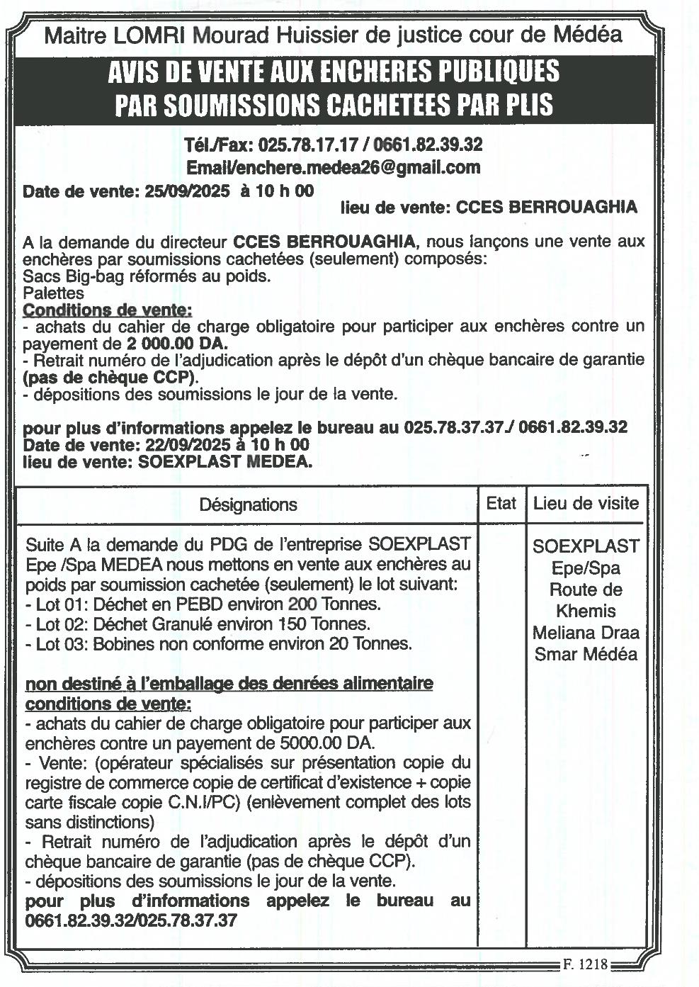 Il sera procédé à la vente au plus offrant et dernier enchérisseur le :