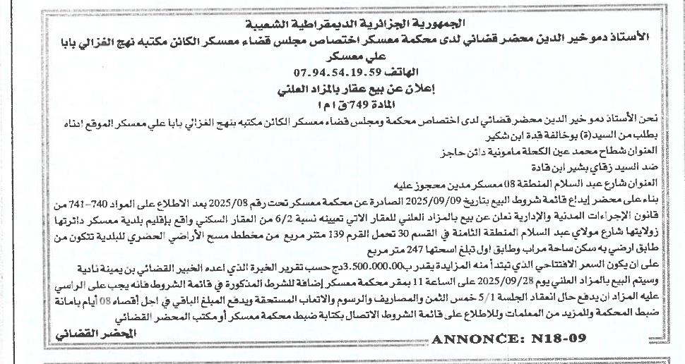 Il sera procédé à la vente au plus offrant et dernier enchérisseur le :