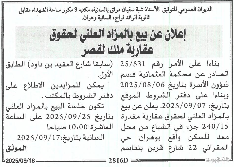Il sera procédé à la vente au plus offrant et dernier enchérisseur le :