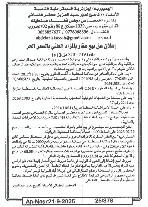 Il sera procédé à la vente au plus offrant et dernier enchérisseur le :