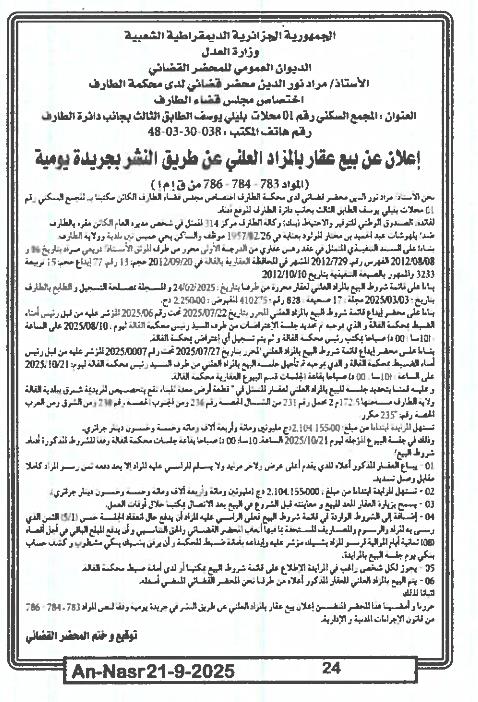 Il sera procédé à la vente au plus offrant et dernier enchérisseur le : 28/09/2025';