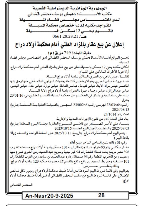 Il sera procédé à la vente au plus offrant et dernier enchérisseur le :