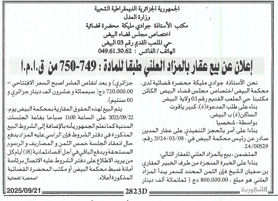 Il sera procédé à la vente au plus offrant et dernier enchérisseur le :