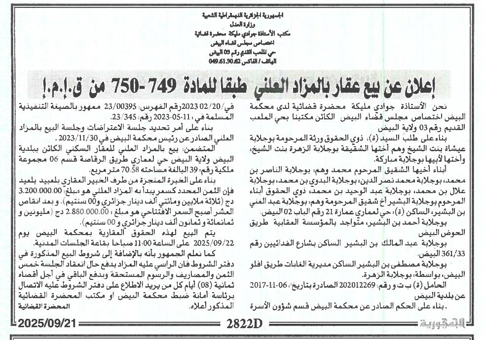 Il sera procédé à la vente au plus offrant et dernier enchérisseur le :