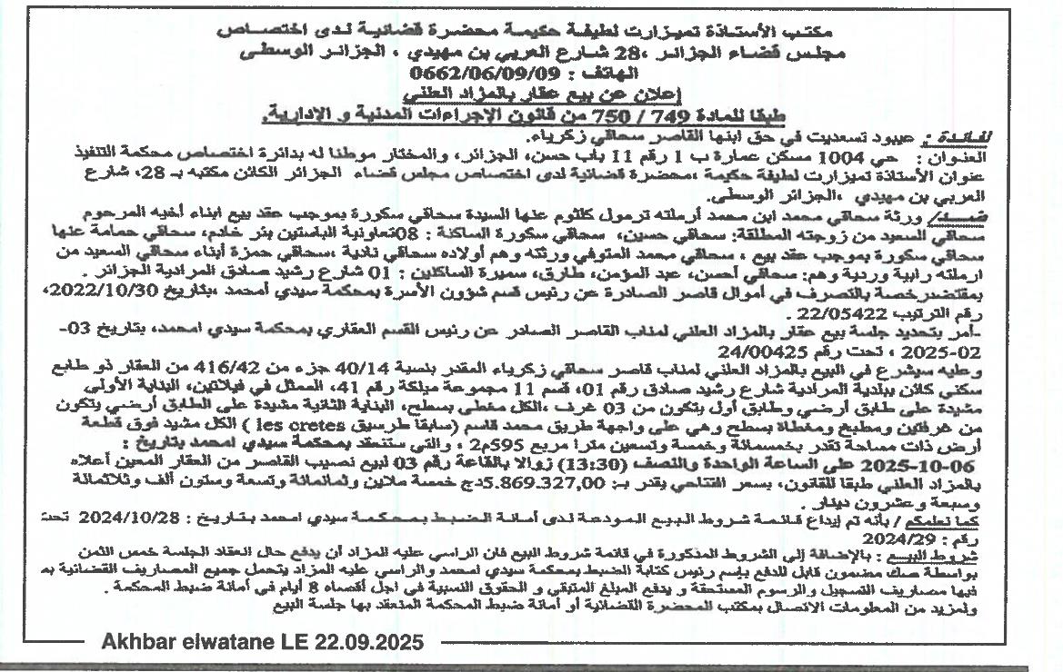 Il sera procédé à la vente au plus offrant et dernier enchérisseur le :