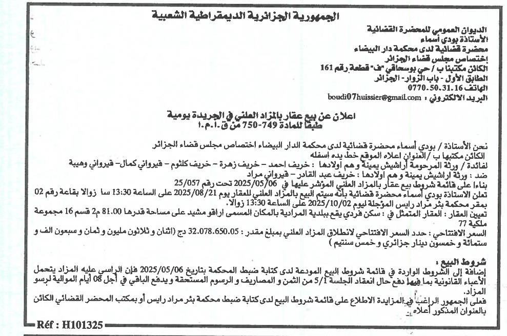 Il sera procédé à la vente au plus offrant et dernier enchérisseur le :
