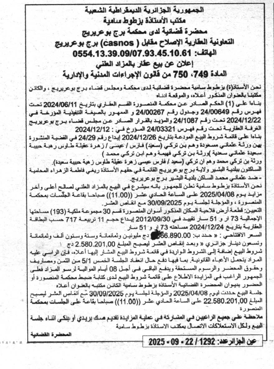 Il sera procédé à la vente au plus offrant et dernier enchérisseur le : 30/09/2025