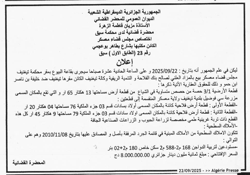 Il sera procédé à la vente au plus offrant et dernier enchérisseur le :
