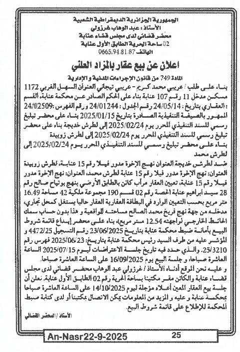 Il sera procédé à la vente au plus offrant et dernier enchérisseur le : 29/09/2025';