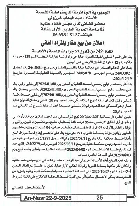 Il sera procédé à la vente au plus offrant et dernier enchérisseur le :