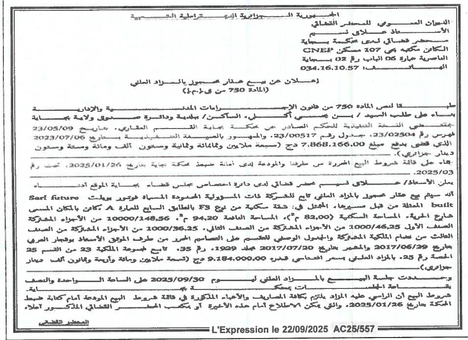 Il sera procédé à la vente au plus offrant et dernier enchérisseur le :
