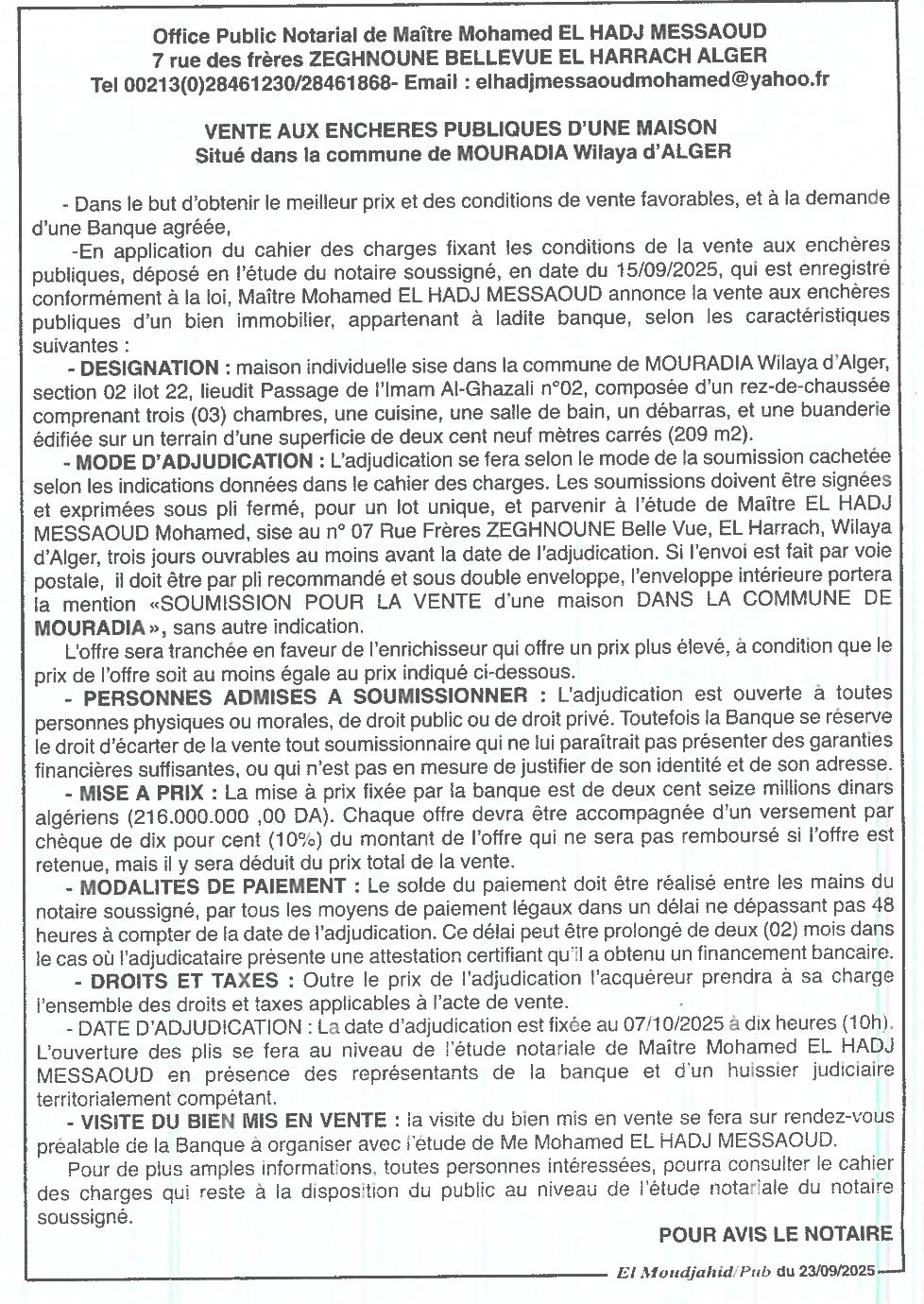 Il sera procédé à la vente au plus offrant et dernier enchérisseur le :