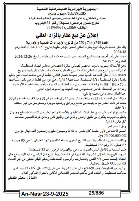 Il sera procédé à la vente au plus offrant et dernier enchérisseur le :