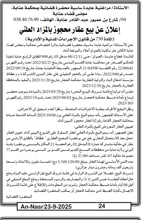 Il sera procédé à la vente au plus offrant et dernier enchérisseur le :
