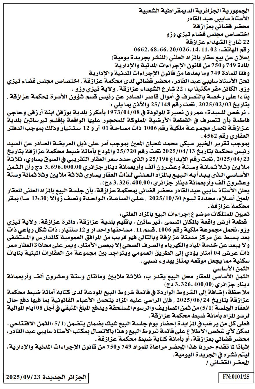 Il sera procédé à la vente au plus offrant et dernier enchérisseur le :
