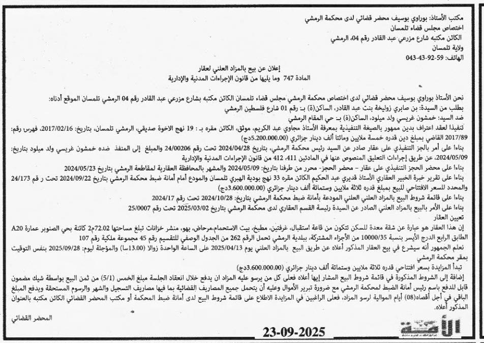 Il sera procédé à la vente au plus offrant et dernier enchérisseur le :