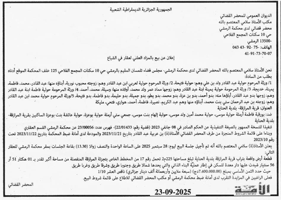 Il sera procédé à la vente au plus offrant et dernier enchérisseur le : 02/10/2025';