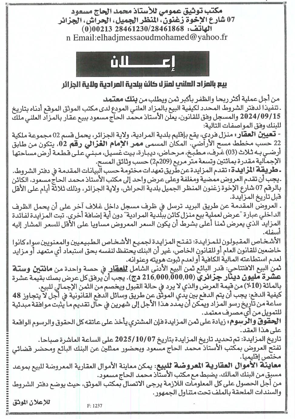 Il sera procédé à la vente au plus offrant et dernier enchérisseur le :