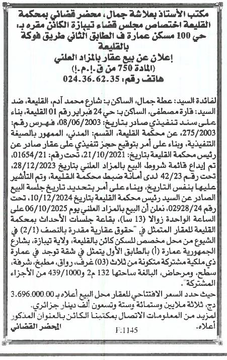 Il sera procédé à la vente au plus offrant et dernier enchérisseur le :