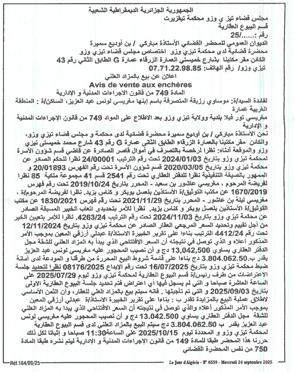 Il sera procédé à la vente au plus offrant et dernier enchérisseur le :