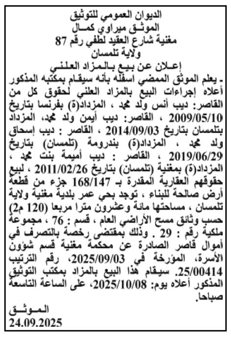 Il sera procédé à la vente au plus offrant et dernier enchérisseur le : 08/10/2025';