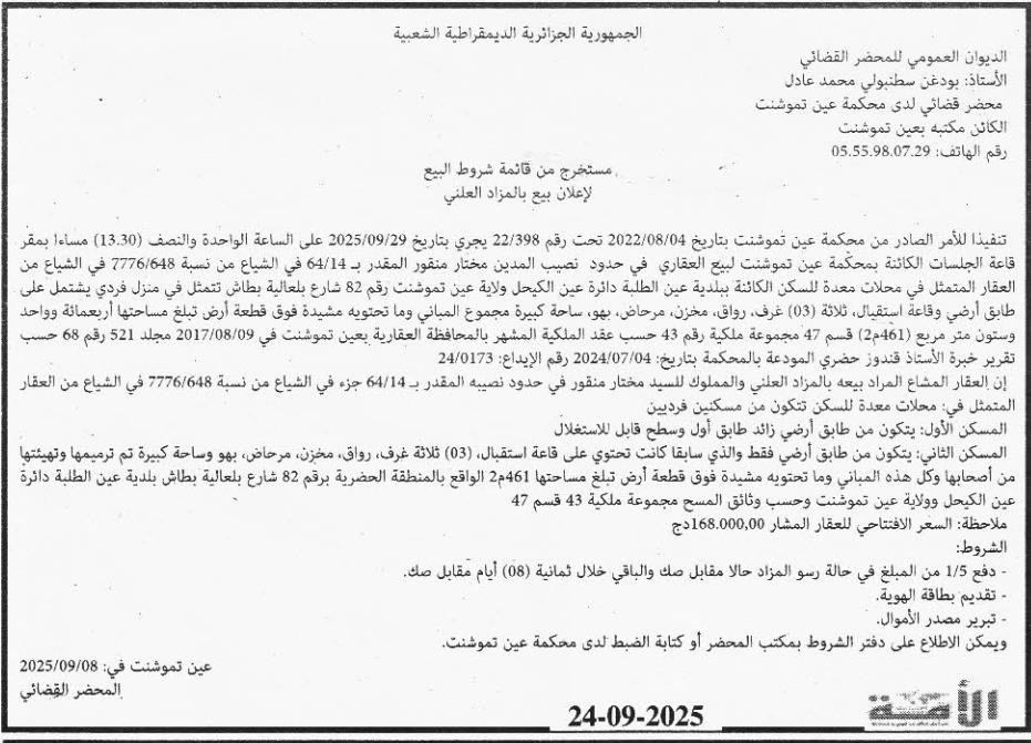 Il sera procédé à la vente au plus offrant et dernier enchérisseur le : 29/09/2025';