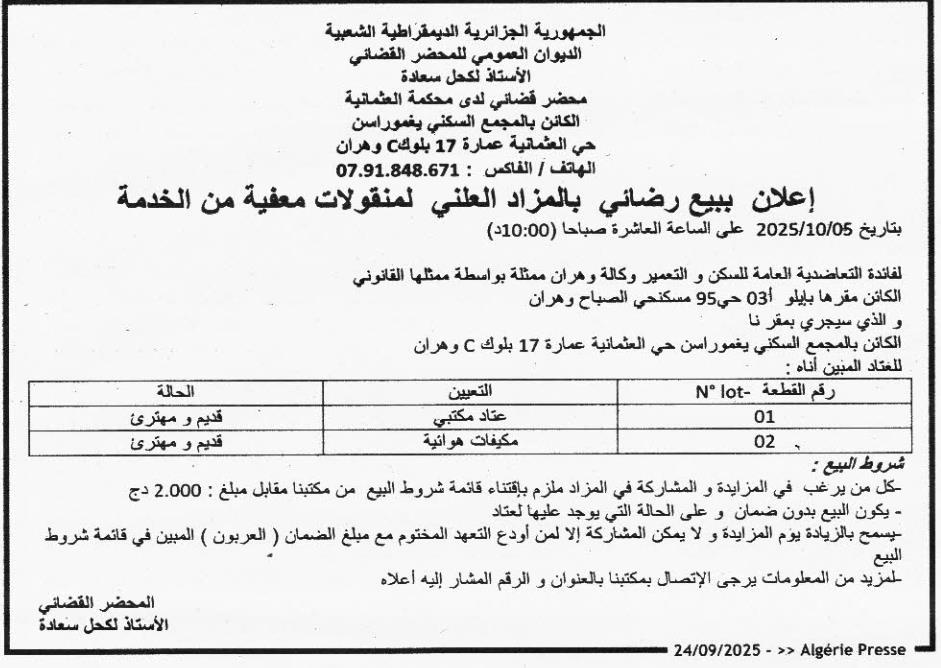 Il sera procédé à la vente au plus offrant et dernier enchérisseur le : 05/10/2025