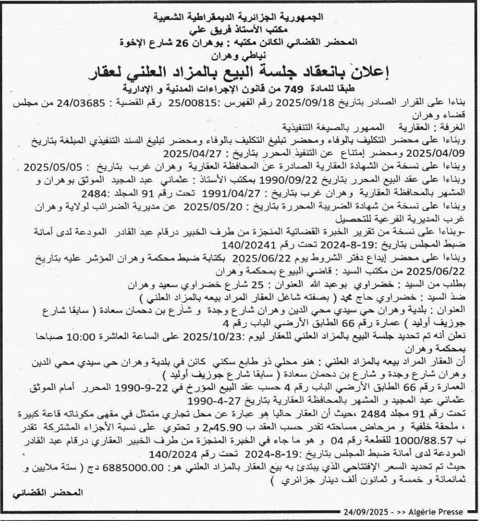 Il sera procédé à la vente au plus offrant et dernier enchérisseur le :
