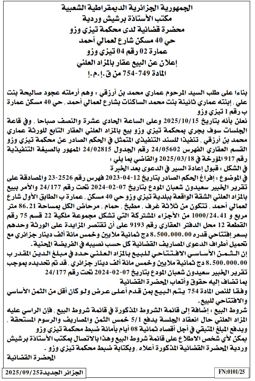 Il sera procédé à la vente au plus offrant et dernier enchérisseur le :